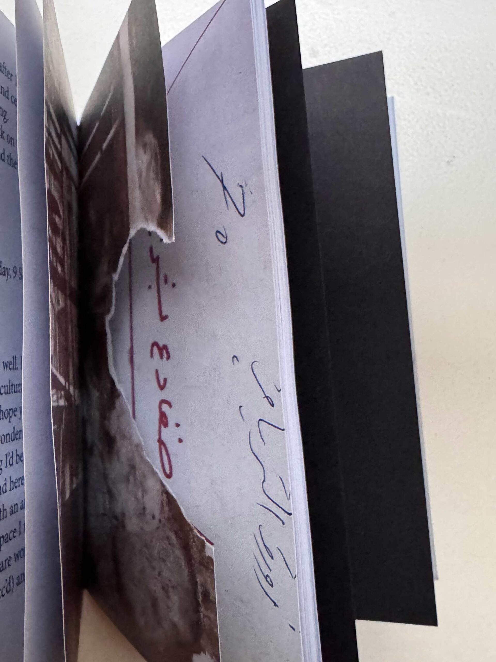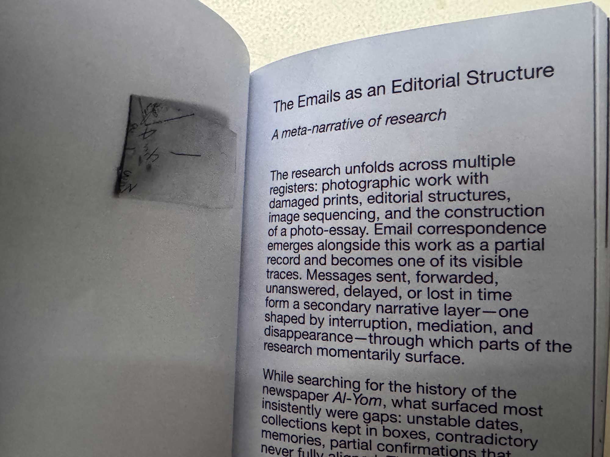 This third edition (2026) revisits and re-edits the project as an unstable correspondence — unfolding across image, archive and text. It consolidates the project’s editorial trajectory, maintaining its original correspondence structure while re-articulating the material sequence of images and texts. Working at A6 format (10.5 × 14.8 cm), the book foregrounds scale and intimacy as structural conditions. The bilingual English/French publication extends the project’s transnational framework, situating Beirut-based archival research within a broader circulation of image practices. Each of the 500 numbered copies forms part of an ongoing engagement with the Al-Yom collection and the politics of photographic preservation and re-editing.