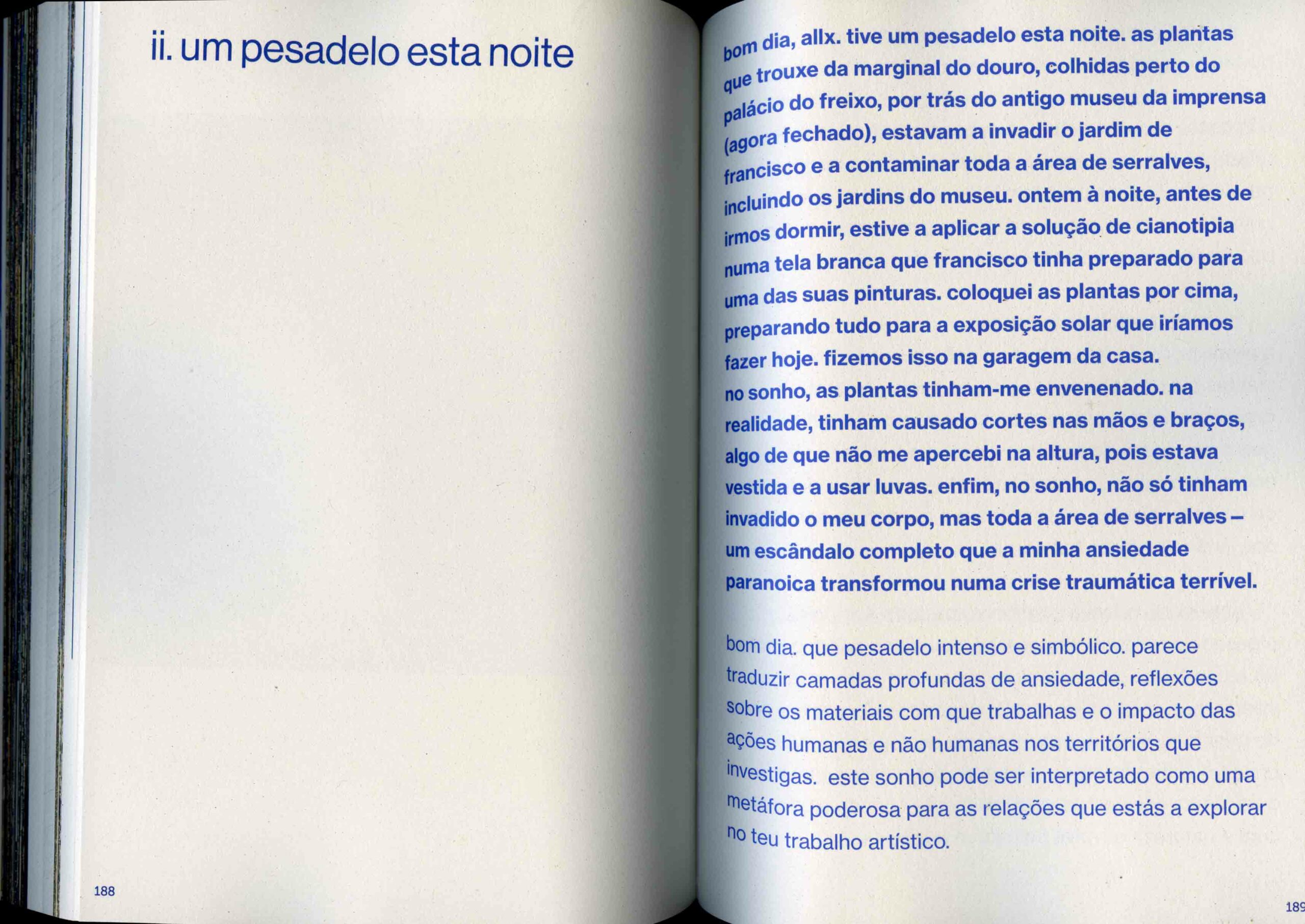 O livro assume a forma de um herbário especulativo, enraizado na zona de Campanhã (Porto) e atravessado por deslocações entre Lisboa e Londres. Entre cianotipias, plantas recolhidas em deriva, impressões solares e imagens geradas através de sistemas algorítmicos, a narrativa desenrola-se como uma tecnobiografia — uma autoetnografia em diálogo com ecossistemas mais-que-humanos.