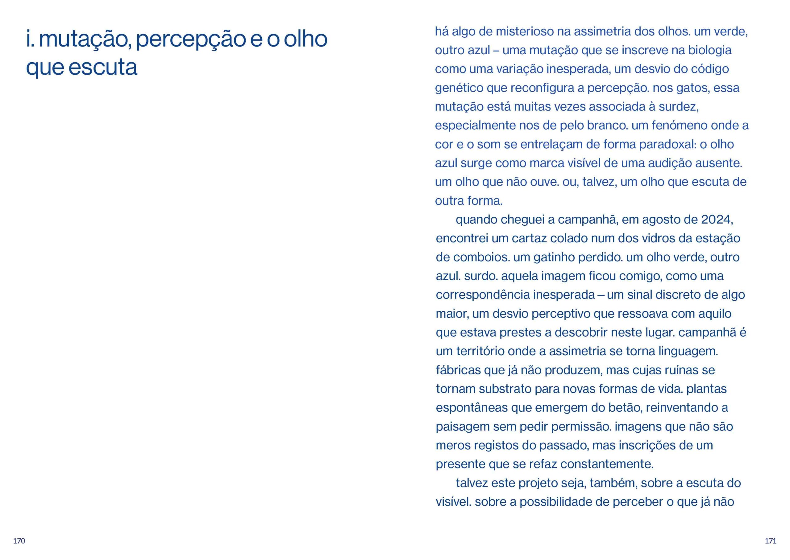 Publicado por msdm publications, o livro integra a instalação Um Olho Verde, o Outro Azul, apresentada em 2025 na Galeria Mira, e propõe-se como um dispositivo de leitura sensível das relações entre corpo, paisagem e imagem fotossensível.